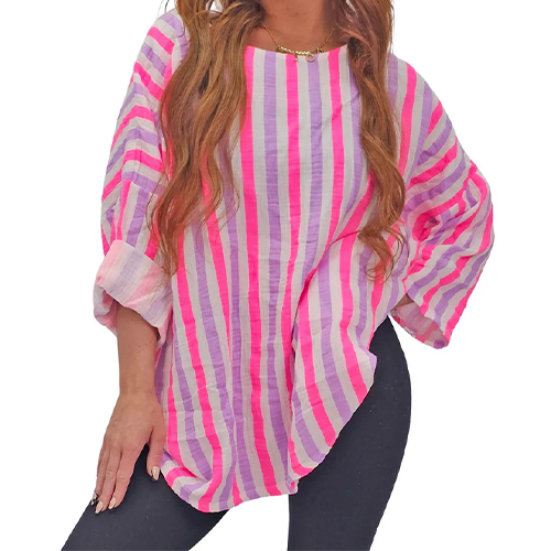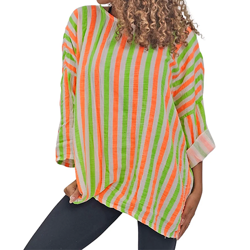 This Italian cotton tunic top is perfect for summer days, offering comfort and style. It features Neon stripes, a wide, round neckline, drop shoulder seams, and 3/4 length sleeves. The top is soft, breathable, and perfect for women seeking both comfort and style. Pair it with cropped trousers or leggings for a chic daytime look.
